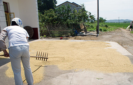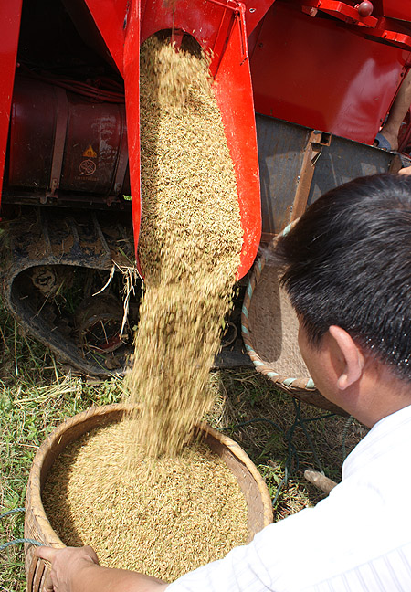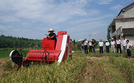 7月20日上午,我院新农村建设综合实验基地――娄底经济开发区中阳村迎来了两位特殊的“客人”――我院产学研合作实体湘丰娄职农业装备有限公司研制、拥有自主知识产权的4LZ-1.4和4LZ-1.0联合收割机。中阳村早稻刚刚成熟,只见稻田里金黄色沉甸甸的稻穗还衬着青色的稻叶,两台大红色的收割机自如地转身、收割、脱粒、扬草,短短半小时,就将1.5亩稻田收割完毕。稻田的主人曹姓村民将直接从斗仓中放下的稻粒挑回自家房前的坪中,开始铺晒。他很高兴地说:“机器真是好用。以前一亩田我们一家六口壮劳力要收一天,非常辛苦。这个收割机割稻和拌芜同时完成,而且脱粒均匀,很干净,晒好后可以直接收仓。”