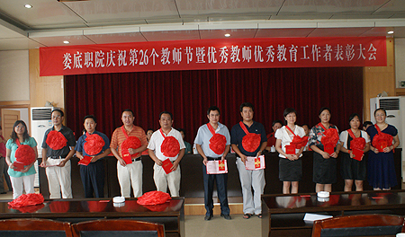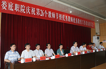 院党委书记陈立楚发表讲话,要求广大教师增强光荣感、责任感,进一步强化教学中心地位、学生主体地位、教师主导地位,努力争做一名优秀的人民教师。陈立楚指出,当教师光荣,当高职教师更光荣,当娄底职院的教师特别光荣,因为我们是一个团结和谐的战斗集体,大局稳定,发展迅速,在近年来的激烈竞争中,始终保持良好发展态势。他向全体教师提出四点要求:一是既要重视知识积累,又要重视品德的涵养;二是既要重视学历职称层次的提高,又要重视整体教学水平的提升;三是既要重视理论的学习,又要重视实际动手操作能力水平的提高;四是既要注重教会学生做人,又要注重教会学生做事、创业。
