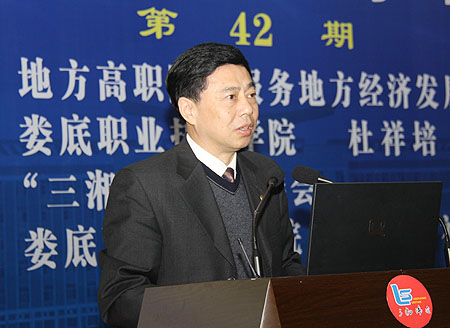 会上,杜祥培教授指出,服务地方经济发展是地方高职院校存在价值之所在、发展动力之所在、办学质量标志之所在,服务地方经济发展是地方高职院校的神圣使命。他强调,地方高职院校要真正实现服务地方经济发展的目标,必须选择相应的途径和方式:坚持“地方性”、“职业性”、“高等性”的办学定位是基础,专业与产业的对接是关键,产学研一体化是途径,人才培养是根本落脚点。最后,他介绍了8803威尼斯检查中心服务地方经济发展的一些尝试。例如:主动适应娄底市产业结构优化升级和融入长株潭建设“两型社会”的发展战略需要,形成与区域战略性支柱产业相适应的专业结构;创新校企合作办学体制机制,探索形成公办民助的能源产业学院模式、农机技术创新的产学研联盟模式、综合服务的院村合作模式;加强社会服务能力建设,建成娄底市新产品新技术研发推广服务中心、职业培训认证中心、社区服务与职业文化传播中心、新农村建设促进中心。下一步目标是:以建设国家骨干高职院校为契机,经过几年的努力,成为我国中部地区地方高职院校创新办学体制机制的典范,成为服务地方经济社会发展、服务新农村建设的高职教育楷模。