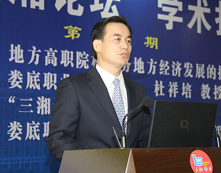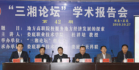 10月27日下午3点,湖南省第42期“三湘论坛”《地方高职院校服务地方经济发展的探索》学术演讲报告会在我院学术报告厅隆重举行,由我院院长、湖南省121人才工程人选、湖南省社会考试学会副会长杜祥培教授作精彩演讲。湖南省社会科学界联合会党组成员、副厅级纪检员郑升研究员、院党委书记陈立楚、长沙理工大学党委书记、博士生导师王耀中教授、中南大学谷中原教授、湖南对外经济贸易职业学院院长屈孝初在主席台就坐,娄底市委宣传部副部长刘道阳、娄底市社科联主席张志倩以及娄底市社科联所属学会代表、我院师生代表共约200人出席了这场精彩的、理论与实际相结合的学术报告会。讲座由郑升主持,陈立楚发表了热情洋溢的致辞,王耀中、谷中原教授应邀作了精彩点评。