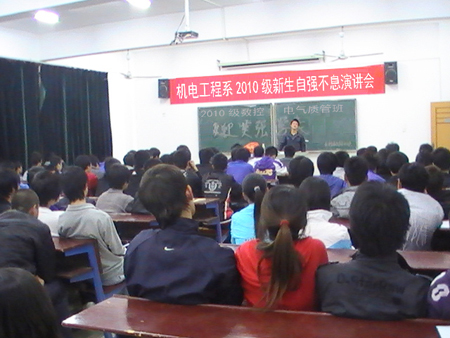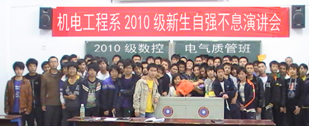 应机电系2010级数控、电气、质管班学生邀请,“自强之星”莫强于11月9日19:30分在主教楼318教室举行了以“自强不息”为主题的演讲,机电系主任张海筹、干事何平、2010级辅导员王会等老师出席了此次演讲会。