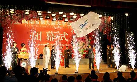 晚上,大运会闭幕式暨颁奖晚会在中南林业科技大学举行。湖南省政协副主席刘晓,湖南省教育厅厅长张放平、副厅长王键,本届大运会组委会相关领导出席。我院运动员、教练等在欧友佳率队下也出席了颁奖晚会。