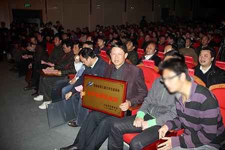 张放平为获得“体育工作先进单位”的14所高校颁发了奖牌,会上宣布了获得“优秀体育代表团”的72所高校名单并向获奖单位颁发了奖牌,此外“代表团团体总分前八名”的大学组、学院组、高职专科组学校也纷纷上台领奖。我院在本届大运会上取得了5金5银7铜的好成绩,获高职专科组团体总分第六名,并荣获“优秀体育代表团”称号。钟军林、廖佰文被评为“优秀教练员”,周威、融道永、张萍君、倪亮辉等8名运动员获“优秀运动员”称号。