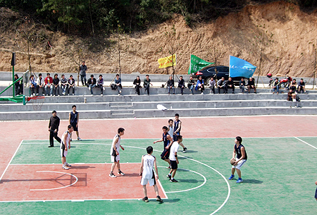 在中阳村白鹭山庄的球场上,我院与娄底五中的篮球争夺战硝烟正漫,由院体艺系主任付鹏亲自督战,队员们一上场就如猛虎下山,迸发出了蓬勃的青春活力,比赛成了我院师生的独角戏,远投、跳投,篮板,一个个干净利落的动作显示了娄职人的精气神,场边的啦啦队也是热情洋溢,呐喊助威。最后我院以84比50的悬殊比分轻松拿下了这场比赛。小伙子们踌躇满志地说:中阳村就是我们的主场,到了这里我们那能够不赢啊。