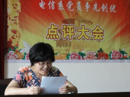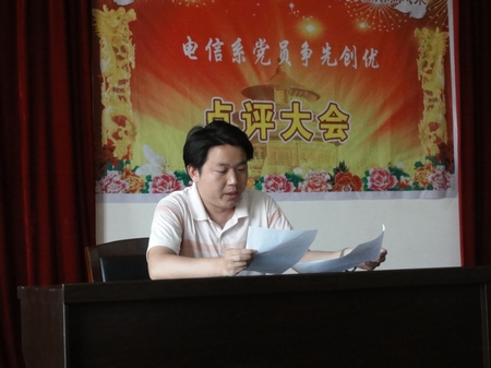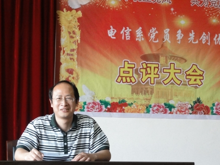 随后,吴莲贵分别对每位党员教师进行了点评。在肯定他们成绩的同时,也分析了他们的问题与不足,并给出了指导性意见,同时,吴莲贵对系部下一阶段开展“创先争优”活动提出了三点要求:一要紧紧围绕系部中心工作,围绕招生就业、专业建设、教学改革,深入推进“创先争优”工作;二是全面总结、常抓不懈,把“创先争优”工作阶段性成果的经验总结推广;三是要以开展创先争优活动为契机,积极探索新形势下的基层党组织建设,充分发挥党员的先锋模范作用,进一步提高党员思想认识,切实解决系部计算机类专业生源下滑的问题。