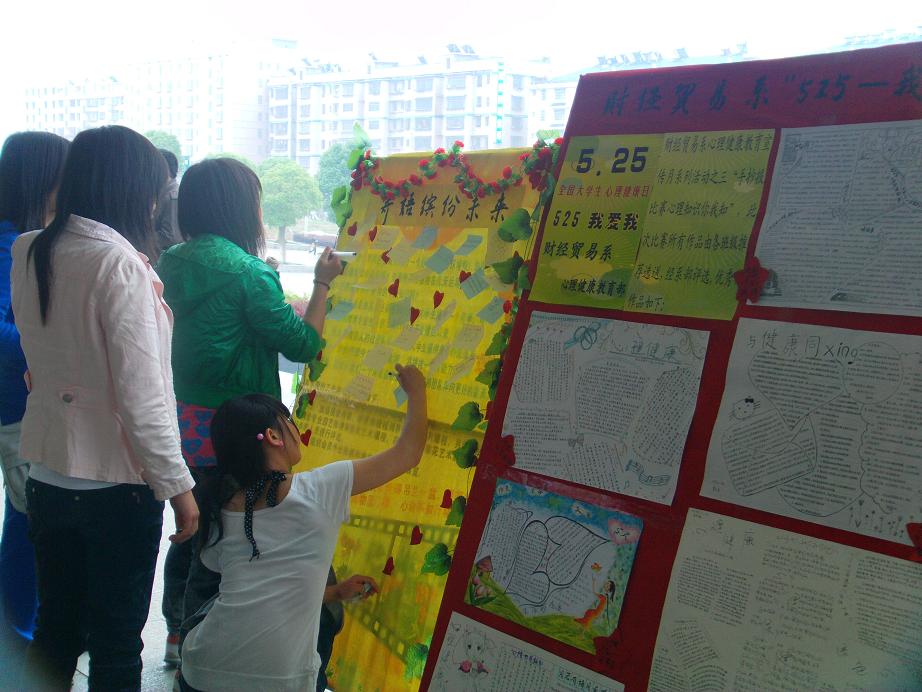 财贸系在继“以爱之名,感恩于心;财经贸易,与你同行”爱心义卖活动之后,5月25日早7:20,在主教学楼前展开了“5.25-我爱我”心理健康宣传活动。