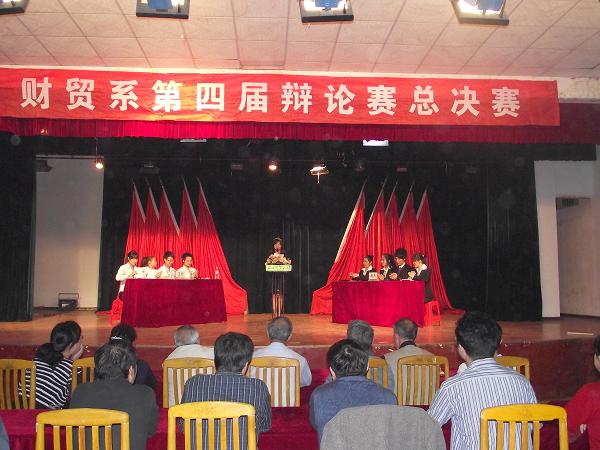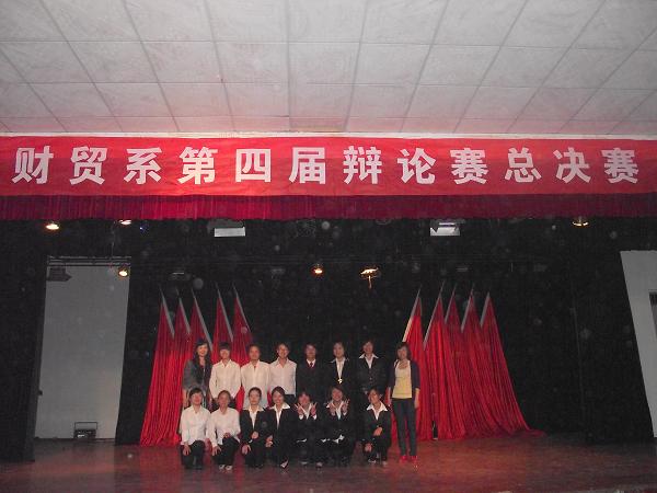 5月26日晚,财贸系第四届大学生辩论赛总决赛在南苑礼堂隆重举行。副院长刘自斌,学工处处长张一军,院团委书记欧芳,学工处副处长罗丽萍、江国元、戴志鹏,财贸系主任朱岳坤、党总支书记蒋美群、学工主任刘媛、教务主任朱阳生、培训主任王青松莅临观赛。09级部分班级及10级全体同学观看此次比赛。由院督导团领导曾慰南、谢若松、陆运夫、沈名长,科技产业处王李平副教授,公管系赵三能副教授、徐续红副教授担任本场比赛评委。