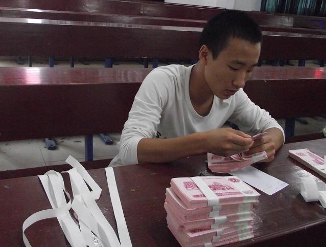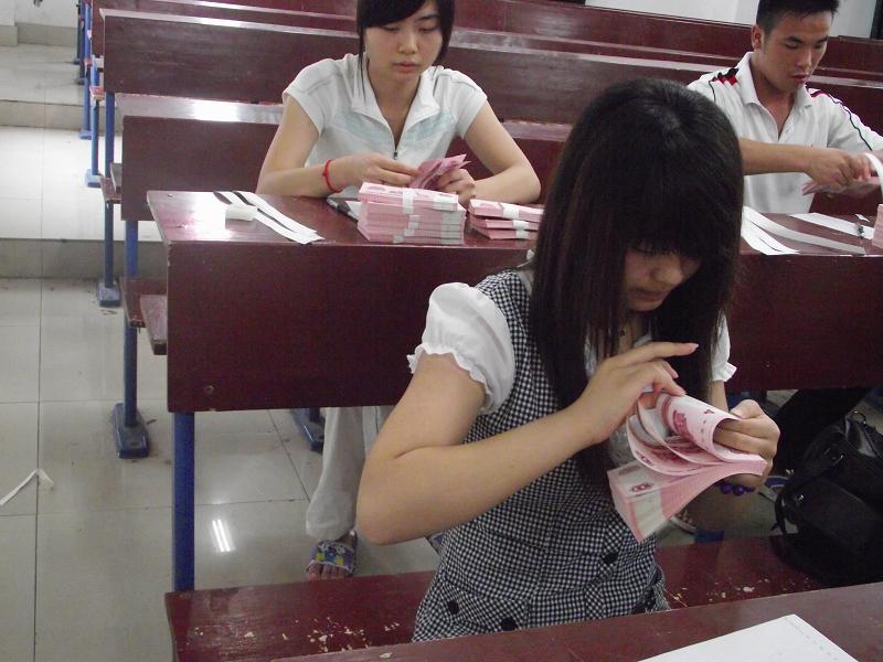 这是一个展现自己实力的好机会,最终每班选出优秀选手10名参与了此次比赛。比赛点钞手法不限,同学们根据自己的擅长采用单指单张、多指多张,在限时的5分钟里刷刷地点起练功券来,然后迅速地用腰条束起来。最后成绩根据选手的速度,准确和点钞的数量决定。