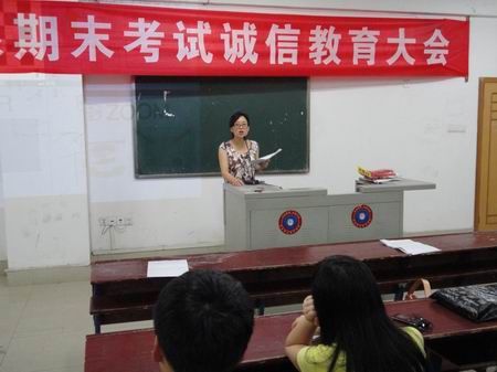 6月15日晚上7点,外语系在主教学楼310举行期末诚信教育考前动员大会,参加大会的有学工主任贺建良、团总支书记陈秀丽、辅导员周春红、杨益及09、10级全体学生。大会由教学主任肖付良主持。
