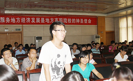 在互动环节,同学们踊跃提问,就如何找到自己的特长、如何求职等向蔡先生请教,还与蔡先生就证券投资、股票市场等专业问题进行了交流。