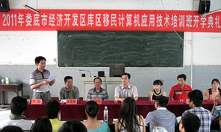 6月30日上午,娄底市经济开发区2011年库区移民计算机应用技术培训班开学典礼在我院隆重举行。我院院长杜祥培,副院长周意坚,市经济开发区移民办、大埠桥办事处和涟滨办事处等单位的负责同志,我院继续教育部主任刘罗仁,副主任李甄,干事肖靓、毛玲英,任课教师黄海平、罗金玲及培训班全体学员参加了开学典礼。仪式由李甄主持。