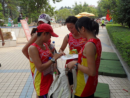 09会大6班的杨海燕说,一开始说要测3000米,5000米,人都被吓倒了。现在每天早上都要在田径场上跑8圈,已经习以为常。以前拿一张图纸要跑一个上午,上山的话还要带个手机,以防万一找不到路向教练队员求救,现在一般不带手机,30-40分钟可以跑完一张图。