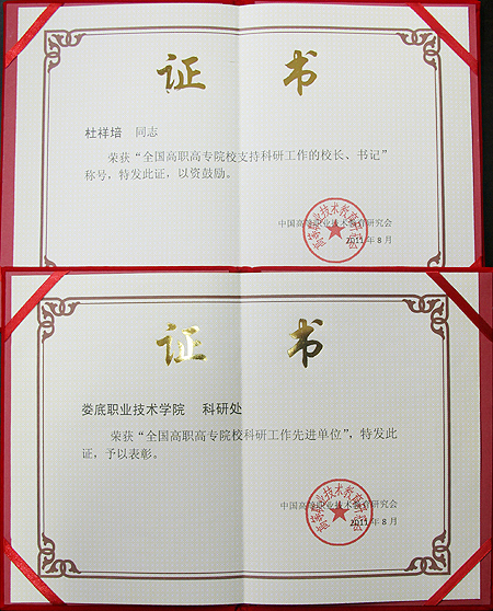 近日,中国高等职业教育研究会科研工作委员会2011年学术年会暨科研先进表彰会在哈尔滨召开,大会表彰了“全国高职高专支持科研工作的校长、书记”和“全国高职高专院校科研先进单位”,我院院长杜祥培评为“全国高职高专院校支持科研工作的校长”、我院科研处评为“全国高职高专院校科研工作先进单位”。