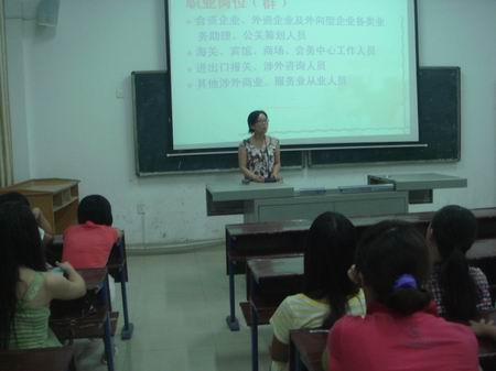 9月4日晚7:30,外语系11级商务英语专业教育讲座在主教学楼416教室举行。讲座由教学副主任肖付良主讲,学工副主任贺建良、辅导员杨益、代理班主任参加,所有11级商务英语专业学生认真聆听讲座。