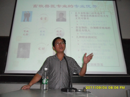于此同时在主教楼412,畜牧兽医专业李继仁老师也为11级畜牧专业的同学开始了专业的详细的介绍。首先,李继仁老师先给大家介绍了专业教学团队,为大家分析了传统养殖与现代畜牧业的差异。重点介绍了畜牧兽医专业是一个“学好专业技术,就业有出路的”校企合作的精品专业。并为同学们展现了许多丰富多彩的教学活动剪影。他说:“有钱有闲的人养宠物,有胆有识的人学畜牧,有智远达之人学牧医。”一番话赢得了同学们的热烈掌声。