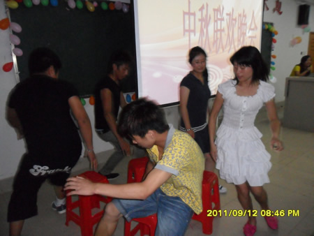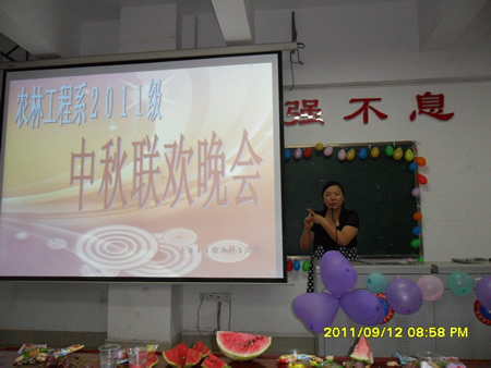 “海上生明月,天涯共此时”。在这阖家团圆,喜迎佳节之际,由我系2011级新生主办的2011年中秋联欢晚会在主教楼410室热烈举行。学工主任易瑜,辅导员朱静姝,助理辅导员,军训教官,系学生会主席团、各部门部长参加晚会,与2011级全体新生共度中秋。