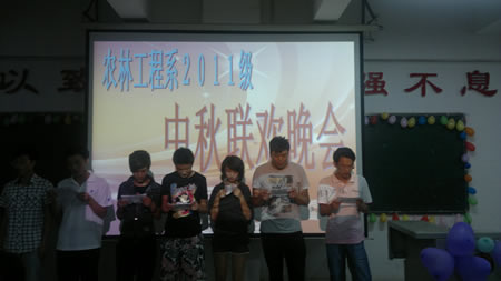 晚会在畜牧班和规划班共同准备的诗朗诵、小合唱《水调歌头*明月几时有》中拉开帷幕。本次晚会节目精彩纷呈,来自全国各地六个民族的同学上台表演了具有本民族特色的节目:土家族的女生二重唱《大山的木叶》刚唱罢,藏族男生便送上了一首四重唱《祝酒歌》、汉族小伙们不甘示弱来了个小合唱《我们的好兄弟》;汉家姑娘们来个歌伴舞《我们的108》,藏家“卓玛”们就来个《锅桩舞》……一个个精彩的节目引来台下阵阵掌声,把晚会推向一个又一个高潮。观众互动的小游戏《踩汽球》、《抢凳子》等活动,为现场营造了浓郁的节目气氛。