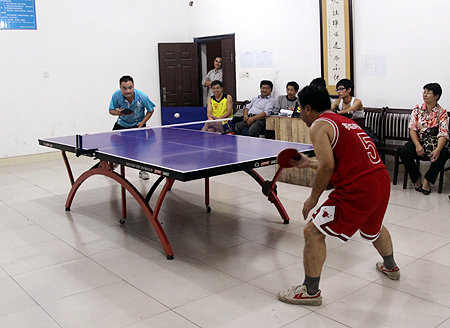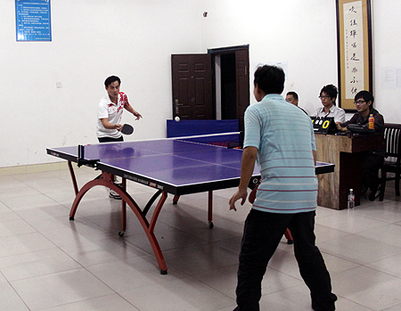赛场上,随着白色小球在乒乓球桌上来回飞舞,院领导们也将他们的水平发挥得淋漓尽致,他们用娴熟的技术将比赛推至高潮,旋转式回球、长抽球等赢得现场阵阵喝彩。