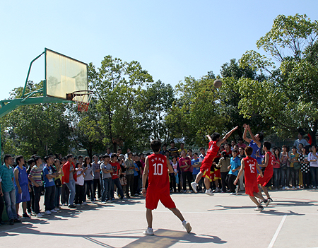 比赛开始,球场上队员们活力十足,精彩的传球截球、定点投篮、带球上篮不断上演,激烈的对抗、完美的配合充分展现出大家为荣誉而战的决心,精湛的球技、配合的默契更是赢得现场啦啦队接连不断的掌声和呐喊声。经过第一轮角逐,最终由财贸系、机电系、电信系及农林系取得首轮对战胜利。