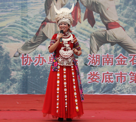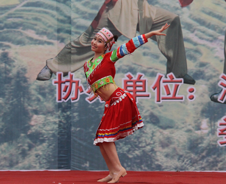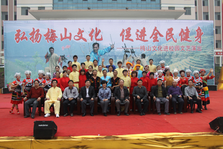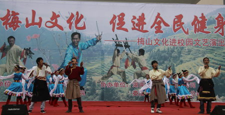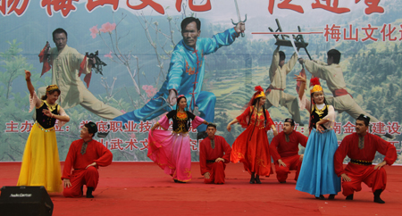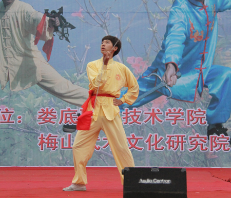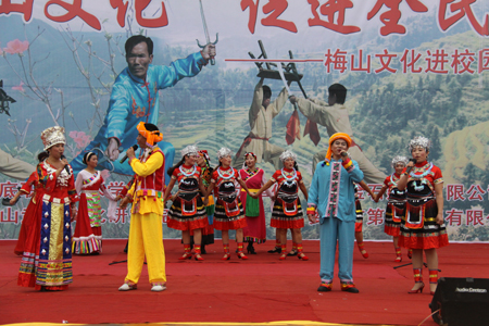 整场文艺演出分武术、山歌两大类,梅山武术文化研究院院长、国家一级武术教练陈益球亲自登台表演。《梅山兵器展》正式拉开了整场演出的帷幕,蚩尤刀、战神枪、老虎凳 、青龙棍、梅山刺等奇特的梅山兵器一一登台亮相,让在场观众目不暇接,大饱眼福;由我院选送的颇具民族风情的维吾尔族歌舞《买西米甫》,藏族学子带来的《吉祥谣》带动了全场观众的热情;独具特色的梅山拳、棍、枪、刀、刺、杈、耙、凳棍对打,使观众大开眼界,博得阵阵掌声;山歌独唱《神仙下凡实难猜》、《土调唱新潮》,联唱《溜溜歌》、《唱支山歌试妹心》、《会唱山歌是神仙》,苗族独舞《女儿嫁》等独具浓厚梅山文化气息的歌舞表演让观众感受到了梅山文化特有的风情和韵味。