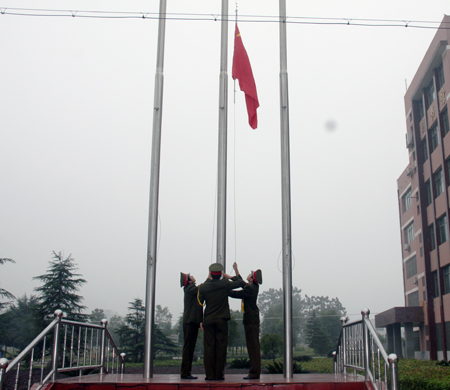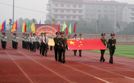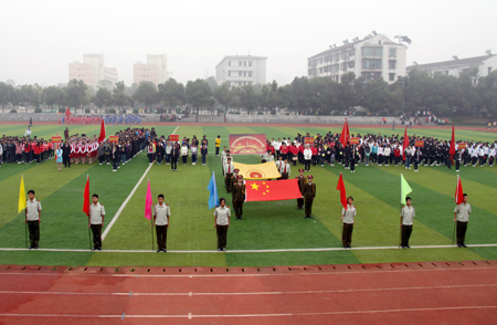 13支精神抖擞的方阵队伍,身着整齐划一的服装,踏着飒爽稳健的步伐,喊着雄壮嘹亮的口号,井然有序地入场。随后升旗仪式开始,全体肃立,国歌响起,鲜艳的五星红旗迎风飘扬,拉开了开幕式的序幕。