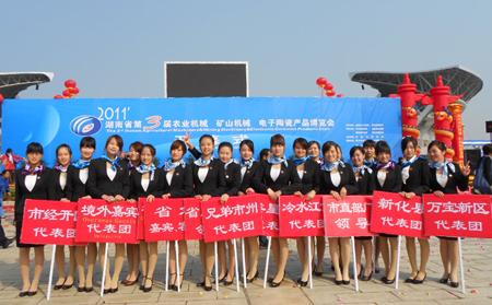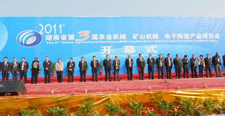 10日上午,由娄底市人民政府、湖南省商务厅共同主办、娄底市商务局承办的2011年湖南省第三届“农业机械、矿山机械、电子陶瓷产品博览会”在娄底新体育馆隆重开幕。来自东盟、欧盟等40多个国家和地区的政要、客商,20个发展中国家的新闻官员及近100名境外客商出席开幕式。来自广东、福建等省外参展企业与全省11个市州、娄底各县市区组团的200多家企业参展,参展产品近3000个,展示了农业机械、矿山机械、电子陶瓷等产业领域的新产品和新技术。