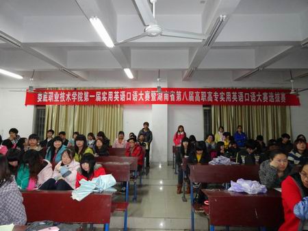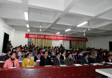 为营造全院学习英语口语的良好氛围,展现和提高我院学生英语口语表达水平,并藉此选拔优秀人才参加湖南省第八届高职高专实用英语口语大赛,11月30日晚7:00 ,我院首届实用英语口语大赛暨湖南省高职高专实用英语口语大赛选拔赛在主教学楼110举行。本次比赛由教务处主办、外语系承办,担任大赛评委的有教务处处长胡拥军、外语系主任刘燕、财贸系教学主任朱阳生、公管系教学主任李海莉、外语系学工主任贺建良、教学主任肖付良及周萍、夏美莲老师、外籍教师Robin 和Ramon。