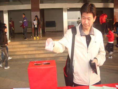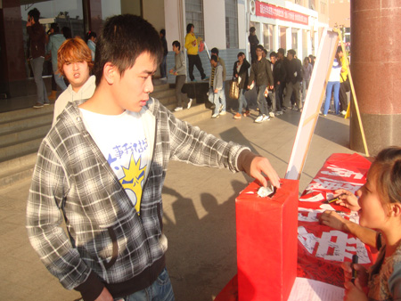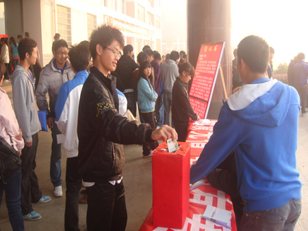 11月24日,机电系志愿者们扛着横幅募捐箱,来到了主教楼门口,他们在忙碌中忘记了寒冷,忘记了早餐,心里却时刻不忘一个人,他就是机电工程系09机大五班的王兴旺同学。