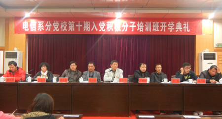 12月4日晚7点,中共娄底职院电信系分党校第十期培训班在多功能报告厅举行开班典礼。党校校长院党委副书记欧友佳、党校副校长组织部长刘高永、党校副校长封权初、农林系党支部副书记易瑜、中专部党支部书记周志和、副主任石磊、电信系分党校校长兼党总支书记吴连贵、教工党支部书记胡楠、学生党支部书记谢政权、培训班班主任赵飞出席了本次开班典礼。典礼由易瑜主持。