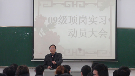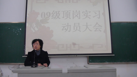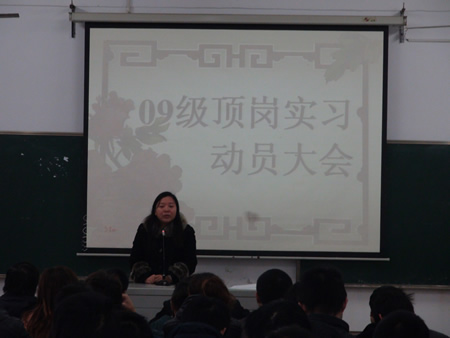 首先,刘梅秋着重讲了三个问题:第一,必须从人才培养的高度来认识顶岗实习是学校教育教学工作的重要环节;第二,高度重视顶岗实习,积极行动,认真完成顶岗实习期间的各项任务;第三,建议同学们要正确认识当前社会就业形势,全面了解实习信息,认识自我,合理定位,确定目标,在严峻的形势面前站稳脚跟,为将来顺利就业打下坚实基础。