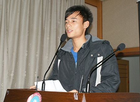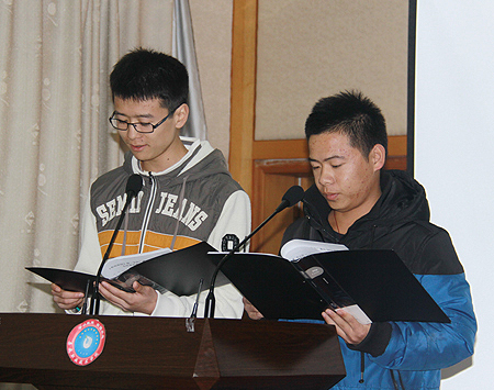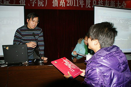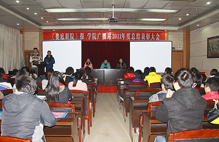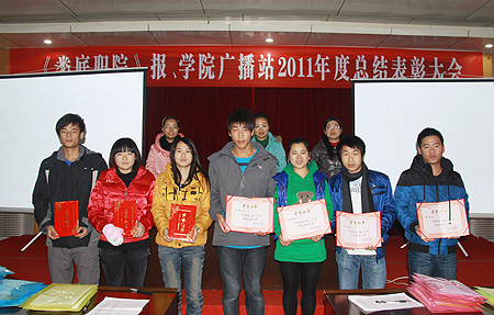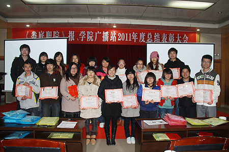 院报学生记者站站长黄军、广播站站长向勇担任此次大会的主持人。首先,主持人宣布了院报和广播站的新任领导班子、新成员名单,并宣读了在2010―2011年度表现突出的优秀个人名单。宣传统战部部长及老师为获奖同学颁奖并合影。