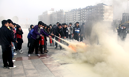 学生学习使用灭火器