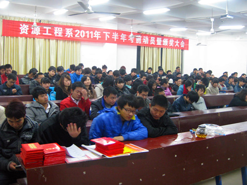 12月27日晚,资源工程系在主教学楼召开2011年下学期考前动员暨颁奖大会,全系同学都参加了大会。与会领导有系主任胡治民教授和系学工主任曾素纯副教授,大会由曾素纯主持。