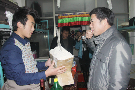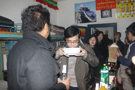 领导和老师们进门后首先进行了撒齐玛的节日仪式,随后品尝了“青稞酒”、“风干牛肉”、“卡塞”等一大批西藏特产,其乐融融。刘自斌语重心长的询问了大家的学习、生活情况,对藏族同学们的热情接待和平日里的优秀表现表示高度的赞扬,在场的领导老师们跟同学们拉起了家常,欢笑连连,并发放红包以表祝福。