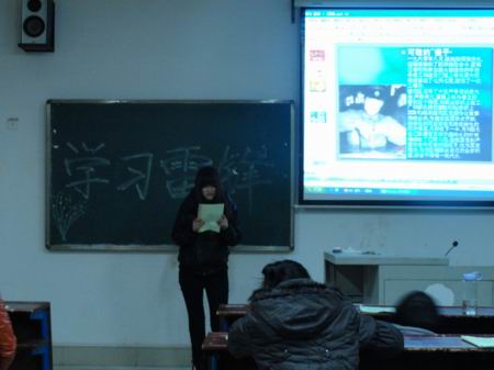 春回大地的三月,一个熟悉的名字又向我走来,他就是雷锋。为深入学习雷锋精神,3月7日晚7:00,外语系11级各班于主教学楼分别开展了以“弘扬雷锋精神,创建文明校园“为主题的班会活动。