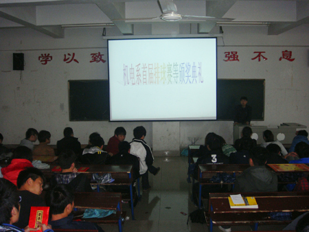 3月30 日中午,机电系在主教楼110教室举行排球比赛颁奖典礼,机电系学工副主任申再林为获奖代表队颁发了奖状及奖金,辅导员黄秧春、刘冬喜、贺莹晶、徐艺、王会及各代表队运动员参加了仪式。