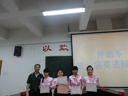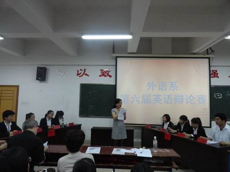 为培养同学们对英语的兴趣,提升英语口语能力。5月9日晚,外语系在主教学楼510举行了第六届英语辩论赛。比赛由胡月及孙田田主持。此次比赛的评委有:系主任刘燕、教学主任肖付良、学工主任贺建良、教学干事龚文锋、辅导员杨益、周春红以及外语系全体同学。