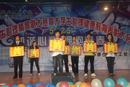 张一军宣读了我院心理健康教育优秀信息员、文化衫设计大赛获奖名单、首届优秀心理咨询案例获奖名单。欧芳公布了本次心理情景剧大赛的获奖情况:电信系《当迷茫泛滥成灾》荣膺一等奖;财贸系《手足情》、《回家》,外语系《最初的梦想》,公管系《雨过天晴》获得二等奖;建艺系《友情那么暖》、《转身拥抱阳光》获得三等奖。与会领导为获奖师生现场颁奖。