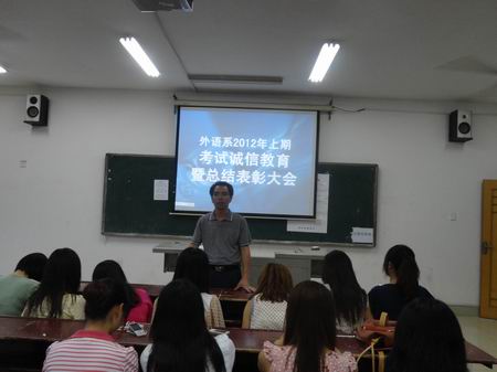 6月17日晚7:00,外语系在主教学楼602举行2012年上学期诚信考试教育暨学生工作总结表彰大会。参加大会的有教学主任肖付良、学工主任贺建良、辅导员杨益、周春红及外语系全体学生。