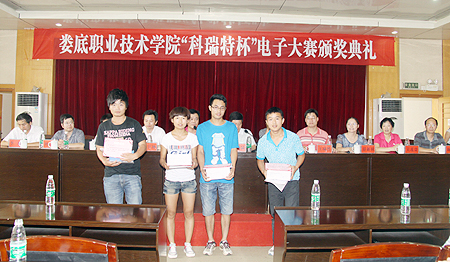 6月20日,第四届“科瑞特杯”电子技能竞赛颁奖典礼在主教学楼报告厅举行。副院长刘自斌、袁其谦、湖南科瑞特电子股份有限公司董事长张玉希、公司领导刘长林、赵永飞、陈玉婷,我院校企合作办主任王威然、电信系主任游新娥、党总支书记吴莲贵、副主任谢完成、刘益洪、李规出席仪式并为获奖者颁奖。电信系电子实验室、应用电子技术专业、通信技术专业全体教师及学生、其他专业获奖学生参加了典礼。典礼由刘自斌主持。