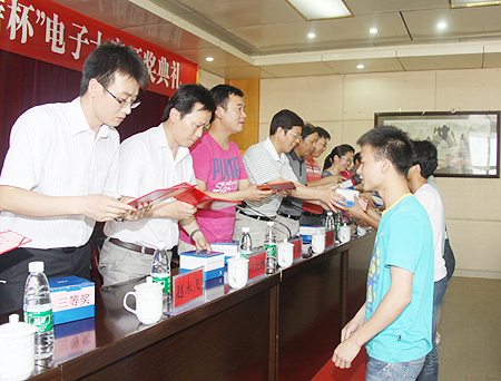 来自四个专业(电信系的应用电子专业、通信专业、智能楼宇专业,机电系的电气自动化专业)两个年级的74名同学参加了比赛。比赛按年级分组,一年级组33人参赛,竞赛内容是进行小型电子产品的组装和调试;二年级组41人参赛,竞赛内容是进行电子产品电路的纠错、分析、组装、设计和调试。经过激烈角逐,最终10通信大1班李素娟、何新财、11电子大2班李绵、11电子大1班龚前兵4人获得一等奖,各收获一台价值千元的电子智能车。黄斌等8人获得二等奖,罗欢等12人获得三等奖,张浩等22人获得优胜奖。出席典礼的领导、嘉宾为获奖选手颁奖。