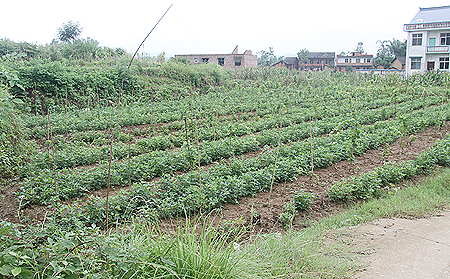 刘老汉介绍说,现在家里种了50多亩水稻,15亩西瓜和香瓜,2亩葡萄,其他物产收入一般,好葡萄市价可达10元一斤,就指着葡萄创收。但今年天气状况不好,上半年连续下了几次冰雹,打死了好多葡萄秧苗,收成还不好估计。回访组一行仔细查看了刘细堂老汉的葡萄苗。曾玉华老师下到地里,手把手地教授刘老汉下一步如何搭架、整形。“两根柱子间三蔸苗,长到一米高,留两个枝,然后往两边拉。”曾玉华细心地给刘老汉示范,教授了几种整形方式,并比较不同方式的区别。“一株不要超过8枝,这样每株可结葡萄8-10斤。”曾玉华反复叮嘱,明年打药非常关键,什么时候打、打什么药、打在哪里、如何打他到时会再提醒和指导。