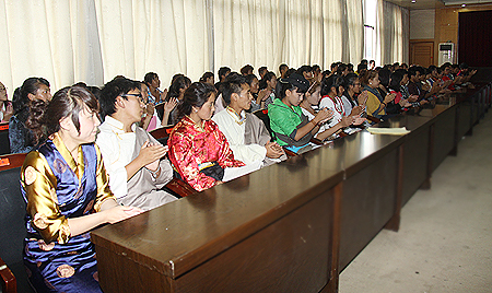 西藏学生们在会上做了精彩的民族歌舞表演。无论是大家耳熟能详的《康定溜溜》歌,还是载歌载舞的《吉祥谣》、《铜嘎》,身穿藏族服装的藏族同学们翩翩起舞,令现场呈现民族团结大融合的浓郁氛围。(欧阳琦)