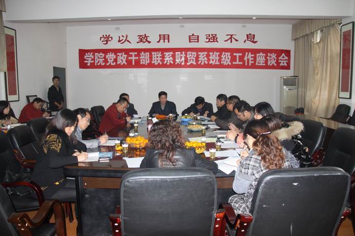 11月15日,我院党政干部联系财贸系班级工作座谈会在实训楼207室举行。学院院长刘自斌,学工处处长张一军、财贸系主任朱岳坤、党总支书记蒋美群、教学主任朱阳生、培训主任王青松出席,学院联系财贸系班级的各科室党政干部及财贸系辅导员参会。座谈会由朱岳坤主持。