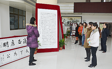 “这幅字遒劲有力,非常有气势。”“这幅联对仗工整,字体纤柔秀美,自成一家……”12月4日,我院纪委联合院教职工书画摄影协会、院团委举办的“喜迎十八大 廉政校园行”书画比赛优秀作品在综合楼大厅展出,吸引了过往的师生观展品评。此次展出优秀作品60余幅,其中硬笔作品30余幅,软笔作品30余幅。在品评鉴赏中,师生们在书画艺术中受到了熏陶,深切感受到了廉政文化的魅力。(欧阳琦)