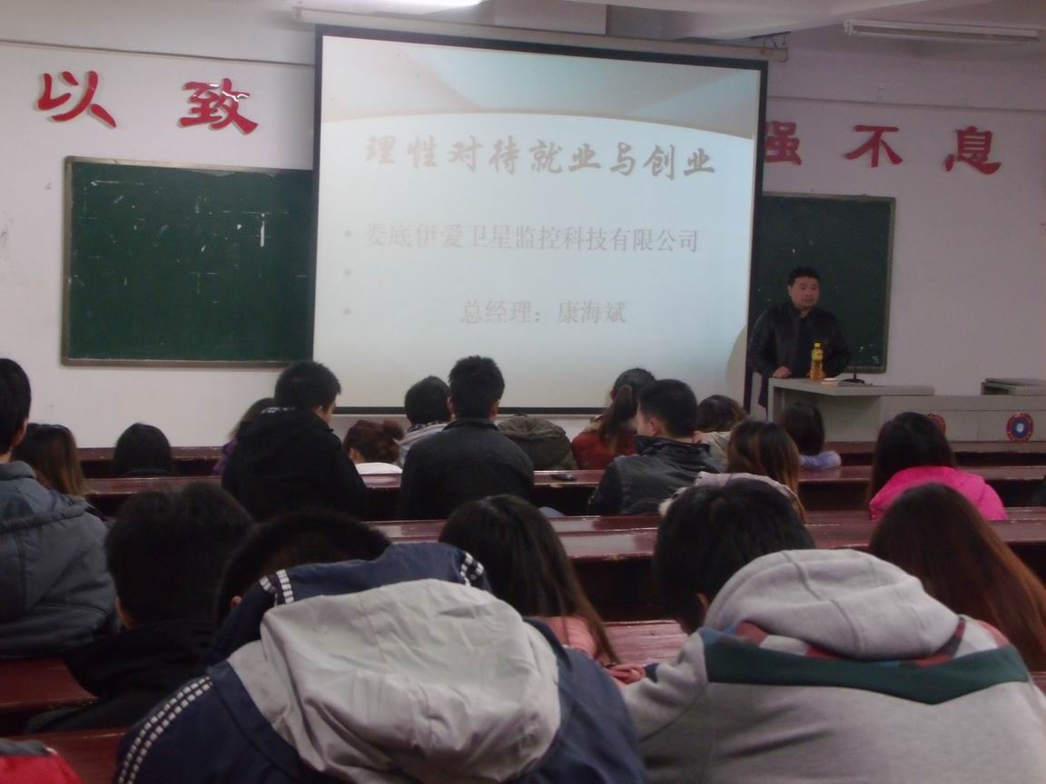 针对即将迈向社会的大三学子们对自己未来之路的迷茫,12月3日,财贸系邀请了娄底伊爱工程工星监控科技有限公司的总经理康海斌在主教楼310室与同学们进行了座谈。专业老师陈智雄、刘卫国和辅导员谢忆老师及10市营与10市订班全体同学参加了此次交流。