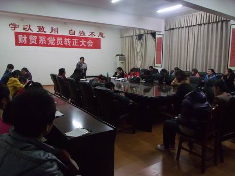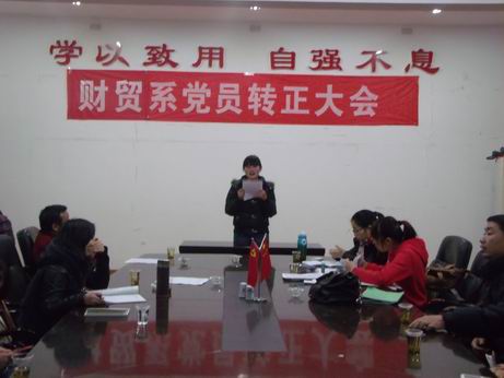 12月6日晚,财贸系学生党支部预备党员转正大会在实训楼207室举行。财贸系党总支书记蒋美群,学生党支部书记刘媛,学生党支部宣传委员成柳才,学生党支部组织委员张雯宇、全体辅导员及全体预备党员参加。大会由张雯宇主持。
