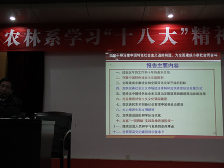 为深入贯彻学习十八大报告及会议精神,12月19日晚,工会主席曾国基在主教楼多功能报告厅为农林系党支部党员、重点培养对象、入党积极分子作了学习“十八大”精神专题讲座。
