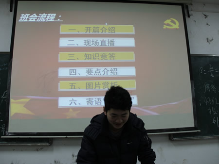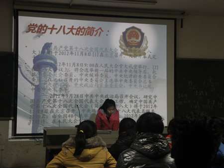 会上,各班就十八大的具体内容进行了详细讲解,对十八大精神展开了深入探讨,并对如何贯彻十八大精神作了具体剖析。在观看有关十八大的视频以及材料后,同学们积极展开讨论,踊跃发表自己的看法,抒发内心的真情实感,表达自己对十八大精神的理解。大家都表示,十八大的精神应该延续下去,并渗透到学习和生活的各个方面,作为大学生应该认真学习,从现在做起,从身边小事做起,努力迎接学业和事业的双丰收。不少班级还通过游戏、签名、有奖竞答等生动活泼的形式让同学们更形象地了解十八大,表达对党的热爱。