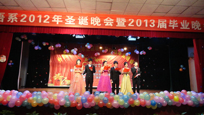 晚会由10订单班的舞蹈《欢天喜地》拉开序幕,欢乐的歌声与优雅的舞姿让会场立刻沸腾。运用中英文双语主持的六位金牌主持人闪亮登场,将晚会带入东西方文化结合的最高境界。10商英班的歌伴舞《青藏高原》,让现场的师生感受到风格清新的异域风情;11订单班的诗朗诵《我的南方和北方》带观众走到了祖国的天南地北;12商英班的小品《绝处逢生》幽默诙趣,赢得了阵阵喝彩声;11订单班的舞蹈《最炫民族风》、12商英班的《浪漫樱花》、10商英班的《风酥雨忆》、10订单班的《那些花儿》、10应教班的《英语律动》、11应教班的《诗歌舞蹈》、12应教班的歌伴舞《采莲曲》、外语系男生表演的《My love》、11商英班的独唱《我的心里只有你没有他》、学生会的现代舞《Pocker face》在这个温馨的夜晚给人以震撼的视觉冲击。另外外语系教师的舞蹈《欢乐中国年》、外教合唱的中文版《甜蜜蜜》表达了对全院师生新年的祝福,将晚会推向了新的高潮。纪委书记邹松建致辞并向两名外教赠送了节日的礼物,同时圣诞老人带着游戏和奖品登场,给幸运观众带来惊喜和礼物,为现场营造了浓郁的圣诞喜庆氛围。